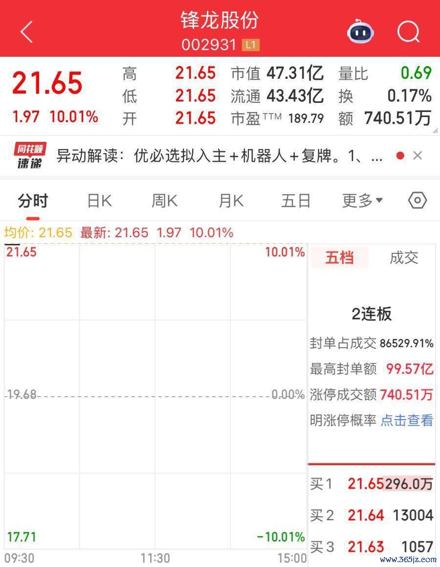12月25日,锋龙股份(002931.SZ)复牌后“一字”涨停,报21.65元/股,总市值为47.31亿元,封单一度超450万手,为畅达盘两倍,最高封单金额近100亿元。